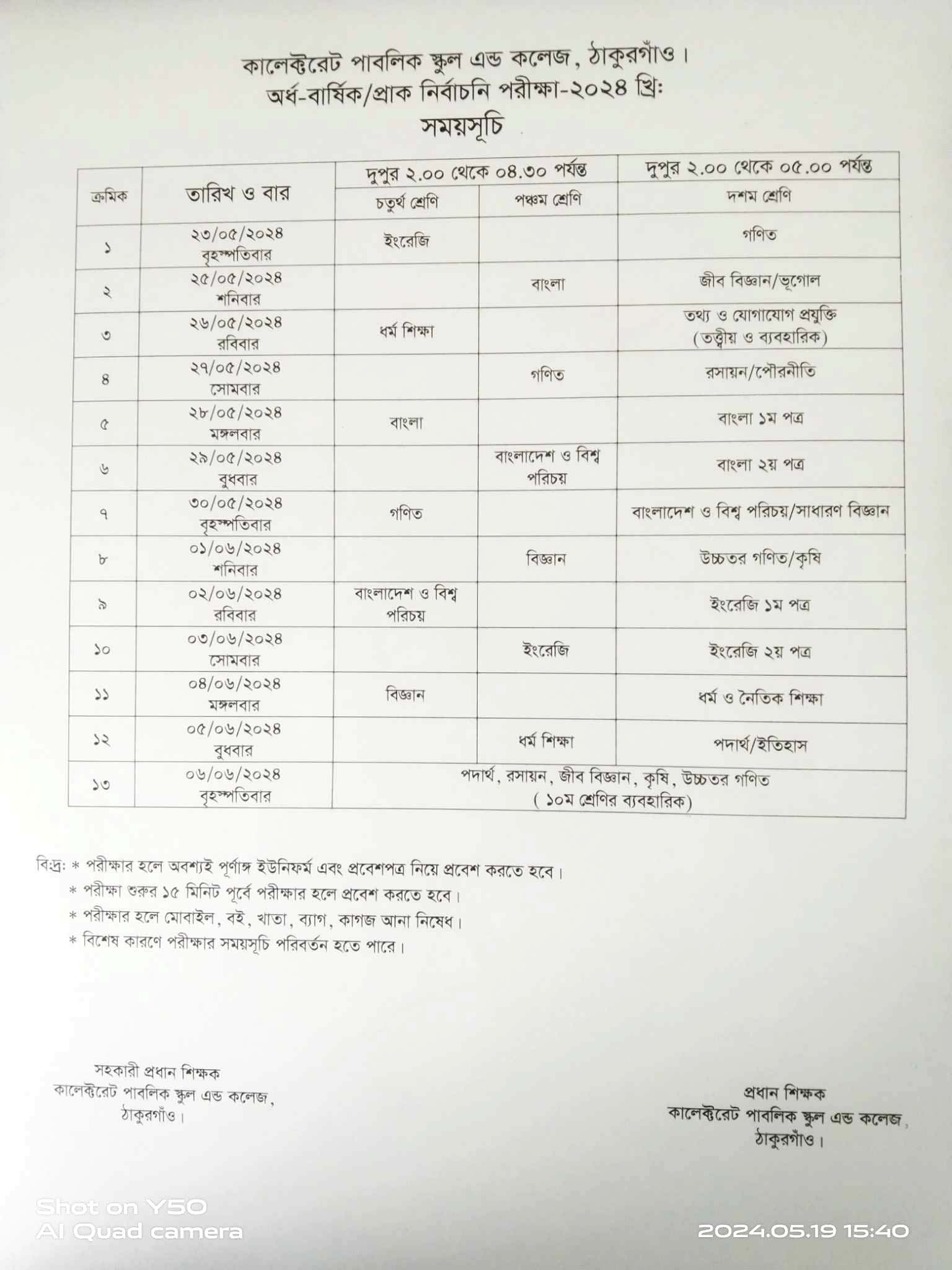Collectorate Public School & College Half-Yearly/Pre-Test Examination Routine