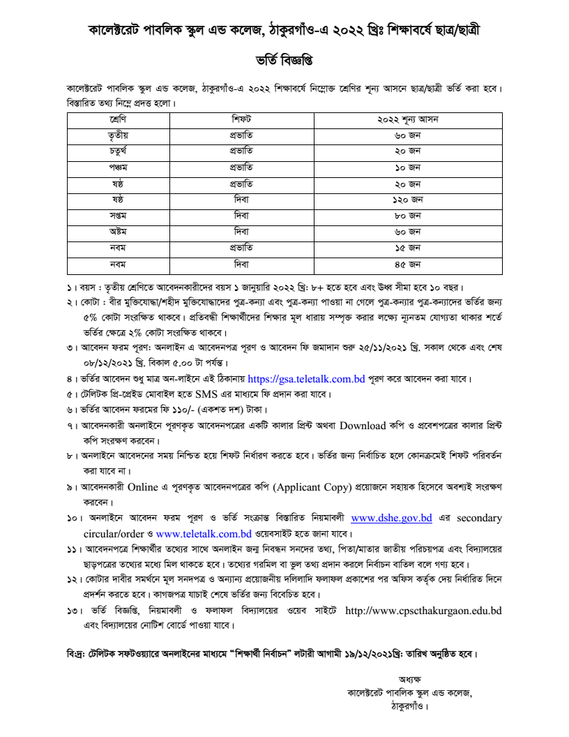 কালেক্টরেট পাবলিক স্কুল এন্ড কলেজ, ঠাকুরগাঁও-এ ৩য় থেকে ৯ম শ্রেণিতে ভর্তির অনলাইন আবেদন চলছে। আবেদনের সময়সীমা ২৪/১০/২৩ খ্রি. হতে ১৪/১১/২৩ খ্রি। পর্যন্ত। আবেদনের লিংকঃ https://gsa.teletalk.com.bd/